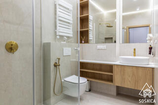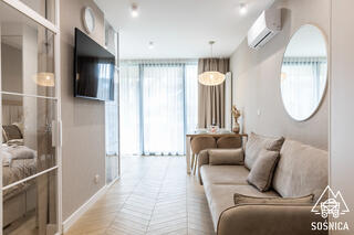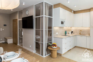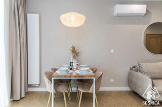 The apartment has one bedroom, a functionally designed living area and a spacious, fully equipped kitchen. Every element has been thought out here - from the harmonious colors to the ergonomic layout of the rooms. An elegant bathroom with a bidet faucet completes the whole, offering comfort and privacy in everyday rituals.