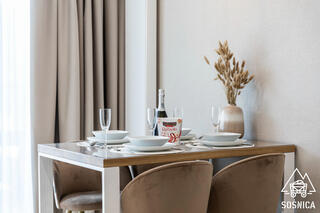 The apartment is equipped with: dishwasher, microwave, fridge, kettle, coffee maker, plates and cutlery, washing machine, 1 TV, iron, hair dryer, towels, bathrobes for adults, bidet tap. The apartment has access to Wi-Fi, heating and air conditioning. Pets are allowed.