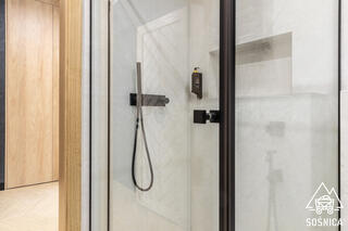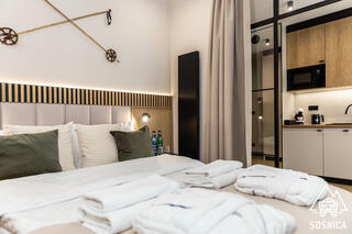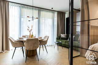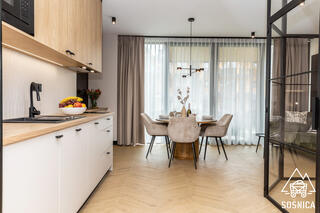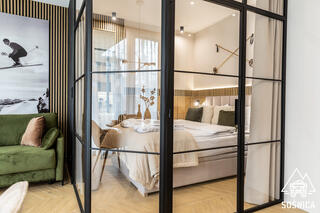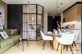The living room leads to a balcony with a view of the Tatra Mountains panorama - a perfect place to start the day with coffee and end it in the silence of the mountain dusk. The apartment has one, glass-walled bedroom, a modern bathroom with a bidet tap and a fully equipped kitchen - all organized with attention to functionality and aesthetics.