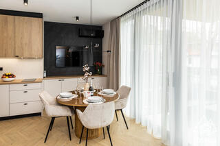 Apartment A40 is a combination of modern elegance with natural warmth, which invites you to stop and rest. The bright, spacious interior is enlivened by the deep green of the sofa, which becomes the heart of the living room - a place for conversations, shared meals and quiet relaxation. A round table, cozy light and wooden accents in the kitchen broken by white create a harmonious whole with character.