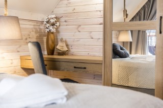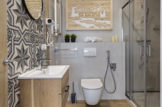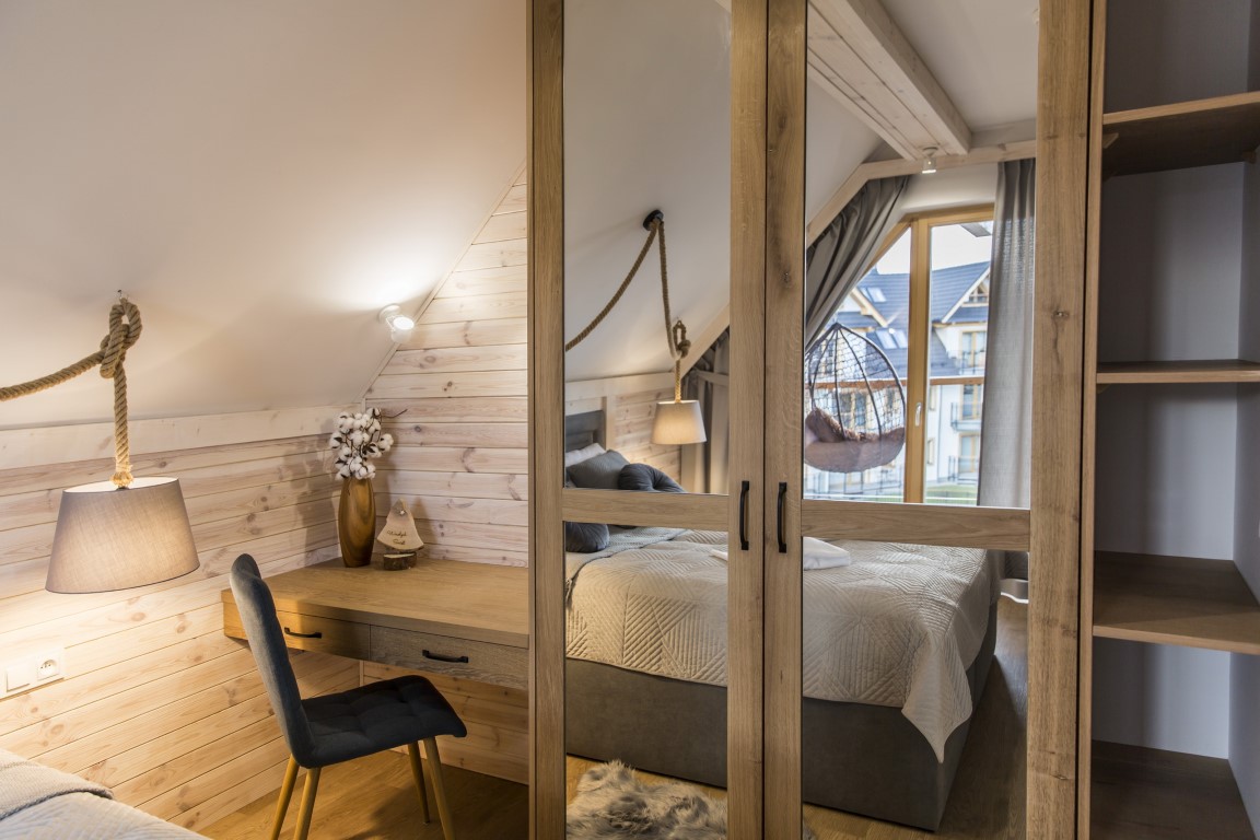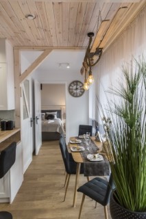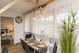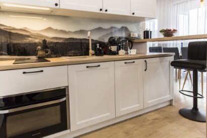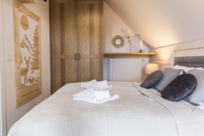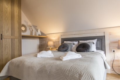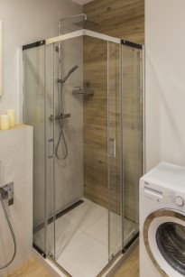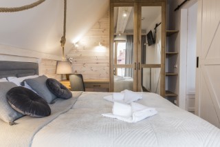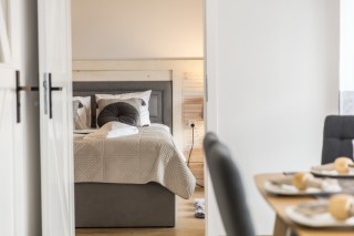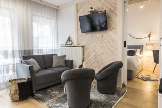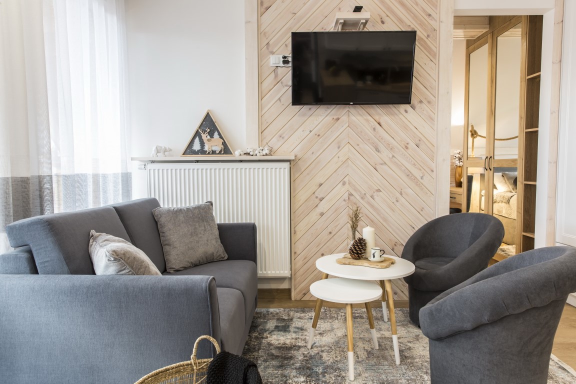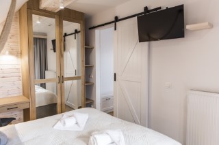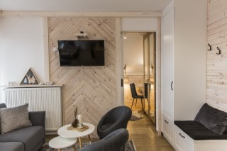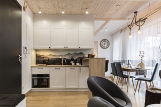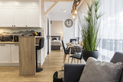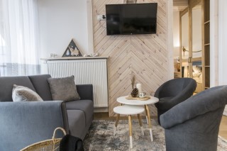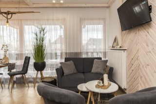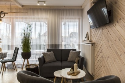The apartment is decorated in modern style with wooden elements . The apartment has two bedrooms, a living room with a sofa and a fully equipped kitchenette with a fridge, a dishwasher, a coffee machine a microwave . Flat-screen TVs are offered. Apartament features free WiFi.