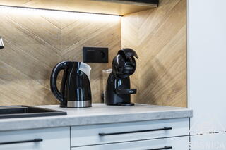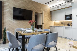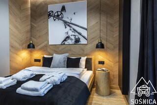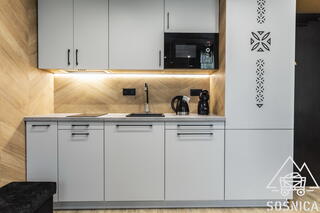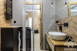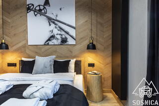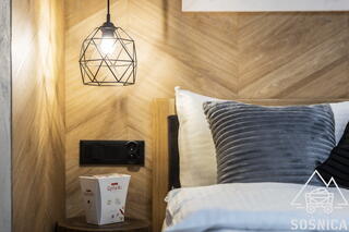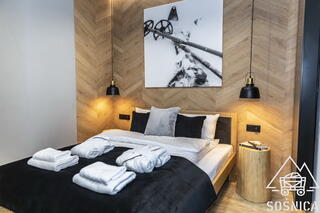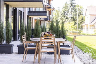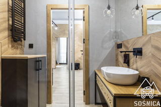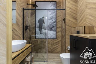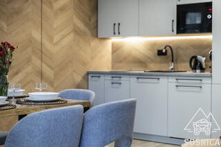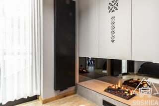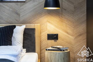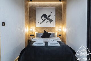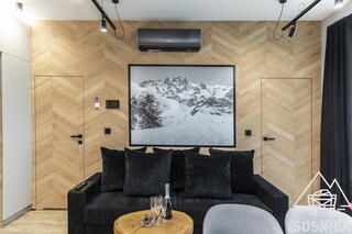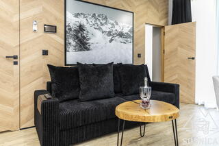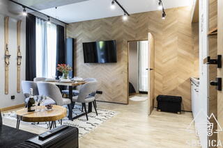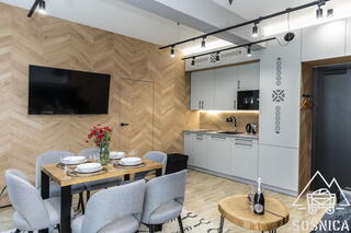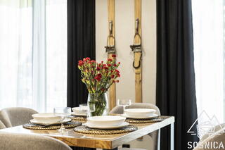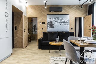 Apartment A6 is a place for those who value space and home comfort. Two bedrooms, a large bathroom and a fireplace in one of the bedrooms create an atmosphere ideal for relaxation after a day full of mountain experiences. The spacious living area with a large table is conducive to shared meals, and the cozy interior combines elegance with a highlander accent. Ideal for families and friends.