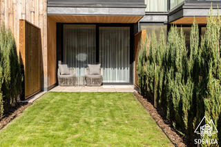 A13 is an apartment that harmoniously combines open space with homely warmth. The living room, bedroom, and kitchen form a single, coherent whole—ideal for couples or solo travelers. Large glass terrace windows open the interior to the surrounding greenery, and the terrace with access to the garden invites you to enjoy your morning coffee in peace and quiet. The interior is cozy and elegant – just right for a peaceful rest after hiking in the Tatra Mountains.
