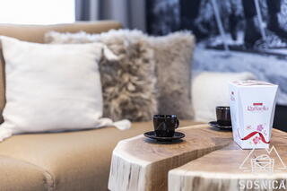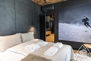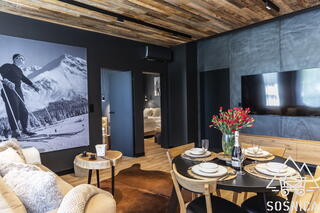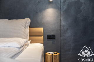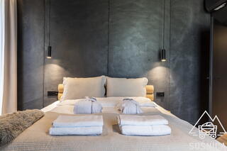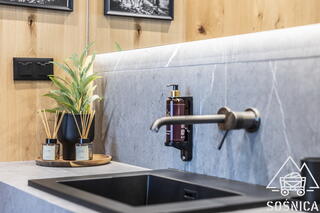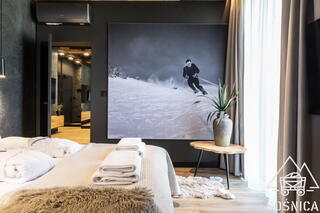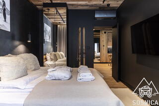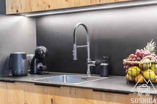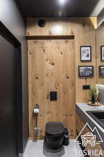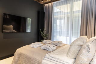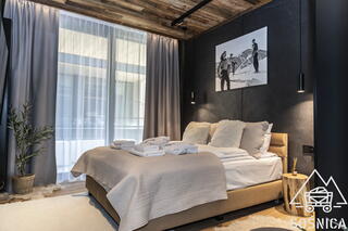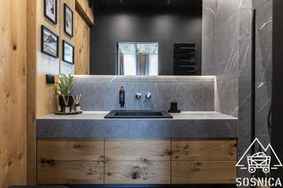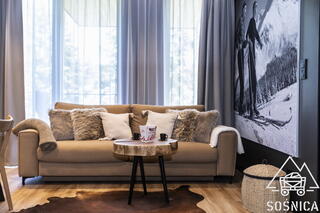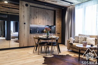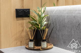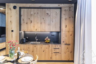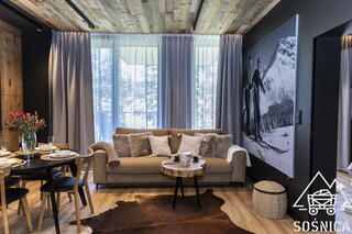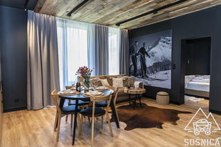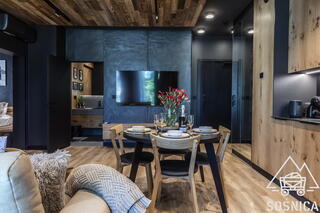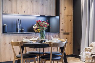 Modernity with a highlander touch – A31 is an apartment where the combination of dark tones and natural wood creates an elegant, yet cozy atmosphere. Two bedrooms provide comfortable relaxation for families or groups of friends. The common space designed for join celebrations has been divided into a kitchen area, a round dining table and a comfortable sofa for join relaxation. Every detail of this interior shows attention to style and functionality.
