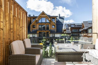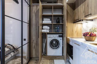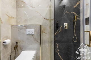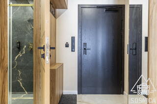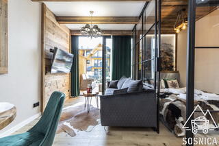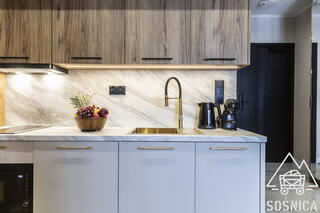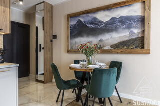 Apartment A37 was created with relaxation in mind – both physical and mental. Colors referring to the Tatra panorama, natural materials and simple forms create an atmosphere of peace and harmony. The open-plan living space combines a comfortable living area, dining room and fully equipped kitchen, and a separate, cozy bedroom allows for a peaceful and comfortable sleep. This is a place that gives a sense of home comfort, and at the same time takes you to the heart of the Tatras – only 500 meters from Krupówki.