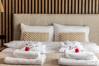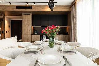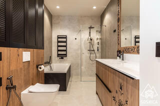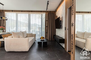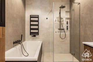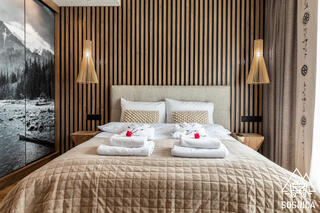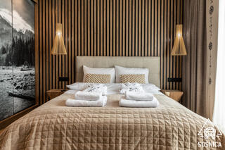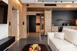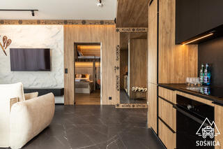 Apartment A53a is a spacious penthouse with a soul - designed for exceptional relaxation at the highest level. Located on the top floor of the building, it offers two balconies with a full view of Giewont and the panorama of the Tatra Mountains, fully equipped with deckchairs and terrace furniture. Inside, guests will find two bedrooms and two bathrooms - one with a bathtub and shower, the other with a modern shower. The apartment has a large living room with a dining table, a stylish kitchen and a comfortable sofa that forms the heart of the apartment. A bright color palette, natural materials and highlander accents in an elegant edition create an atmosphere of silence, light and harmony. Here, every detail has been thought out to make your stay not only comfortable, but also inspiring.