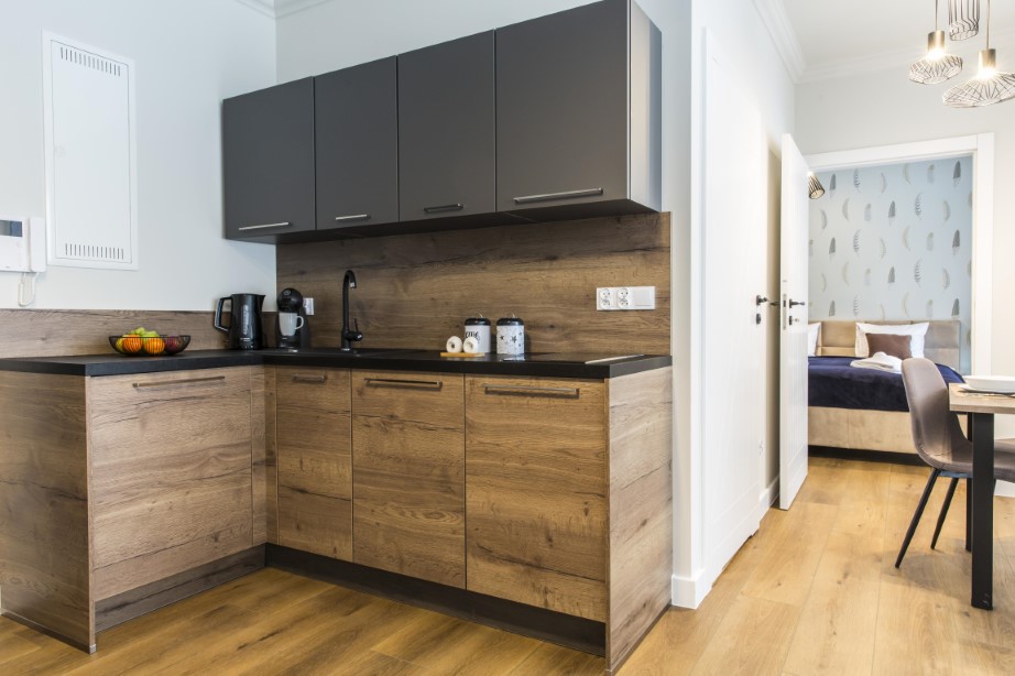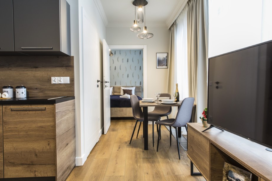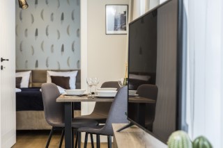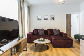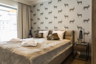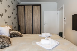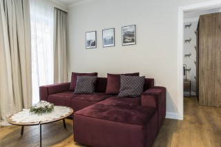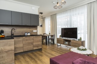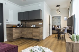 The apartment is decorated in modern style with wooden elements . The apartment has two bedrooms, a living room with a sofa and a fully equipped kitchenette with a fridge, a coffee machine and microwave . Flat-screen TVs are offered. Apartament features free WiFi.