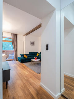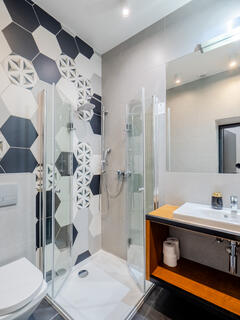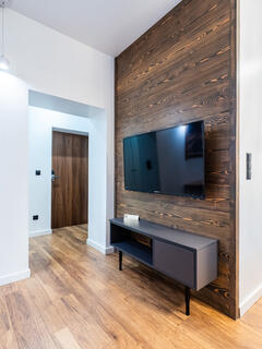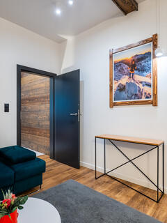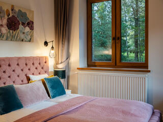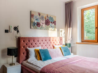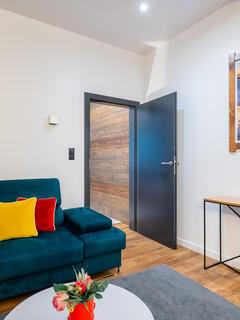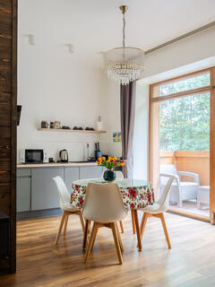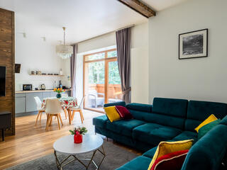 Apartment 3 delights with its cozy atmosphere and modern design. Bright interiors complemented by colorful accents encourage relaxation, while the spacious living area with a comfortable corner sofa invites guests to unwind. The bedroom with a large bed guarantees a restful night's sleep, and the balcony overlooking the greenery allows for a breath of fresh Tatra air.