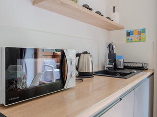 Amenities: kitchenette with induction hob, microwave, kettle, and full tableware, refrigerator, TV, Wi-Fi, balcony with seating area, towels, hairdryer, and shower. The apartment has heating. Pets are welcome.