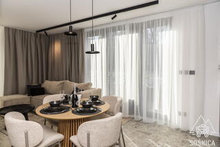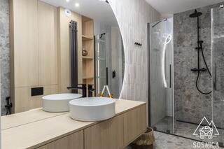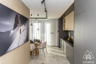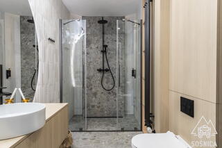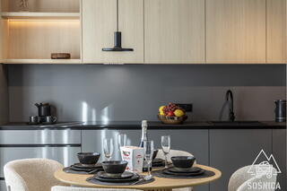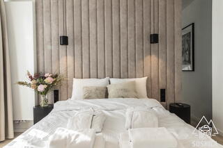 Apartment A19 is an elegant space where modern design meets subtle mountain accents. Subdued colors, natural materials, and soft fabrics create an atmosphere of solace, perfect after a day spent hiking in the Tatra Mountains or in the center of Zakopane – just a short walk away.