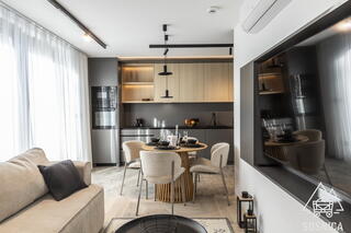 The apartment features a bright bedroom with a comfortable bed, a spacious living room with a seating area, and a fully equipped kitchenette, perfect for longer stays. Carefully selected lighting, minimalist décor, and attention to detail create a space where you immediately feel at ease.