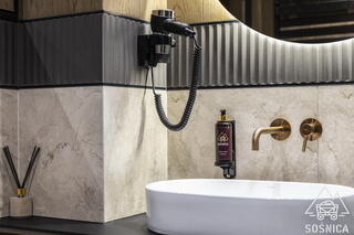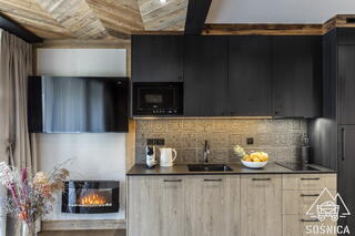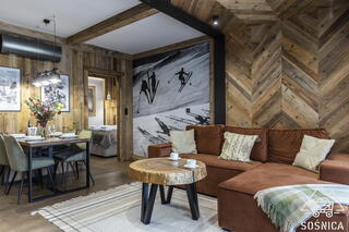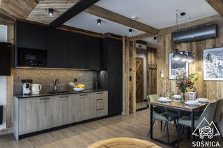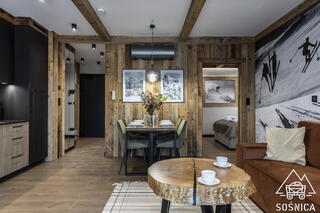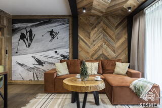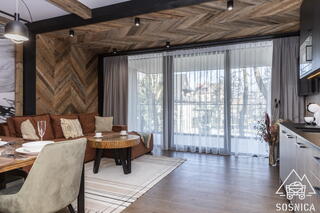 Apartment B21 boasts a stylish interior reminiscent of a modern mountain chalet – naturalwood, soft fabrics, and muted colors create the perfect setting for relaxationin Zakopane. The apartment features one comfortable bedroom with a large bedand a cozy living room with a sofa bed. Large windows illuminate the space, anda designer fireplace adds a cozy atmosphere in the evenings. The kitchenette isfully equipped, and the elegant bathroom features a walk-in shower and a bidet.