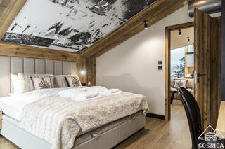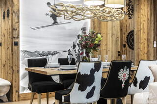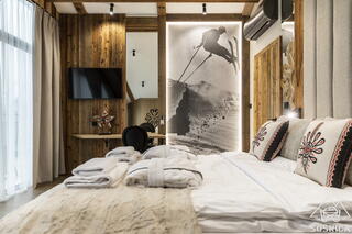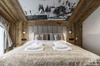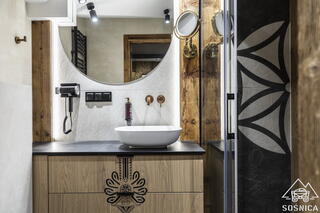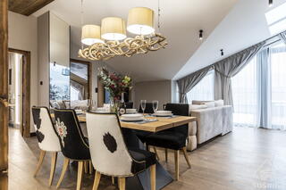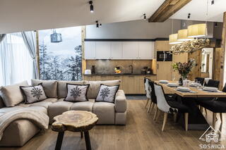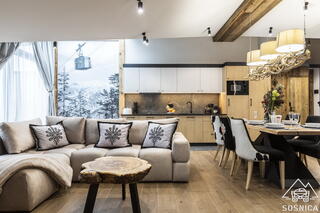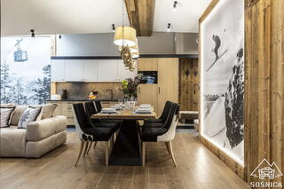 The apartment features two elegant bedrooms and two modern bathrooms , guaranteeing complete comfort even for two couples or families. A spacious living room with designer accents, wallpaper inspired by the winter Tatra Mountains, and a large, comfortable sofa create the atmosphere of a luxurious mountain retreat. The dining room, with its striking chandelier and massive solid wood table, is perfect for shared meals.