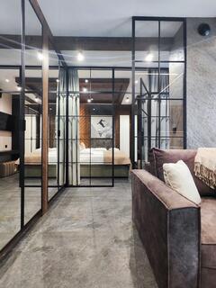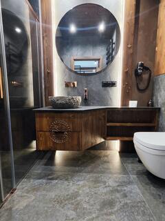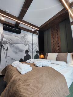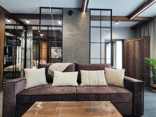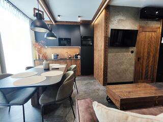 Apartment A43a is an elegant and spacious interior designed in a modern style with distinct mountain accents. Natural wood, stone details and designer lighting create a unique atmosphere, while large glazing ensures access to natural light and mountain views that enhance the character of this place.