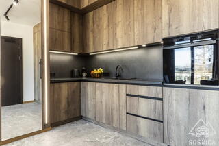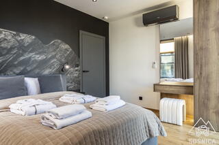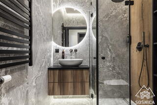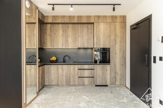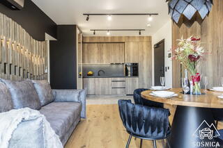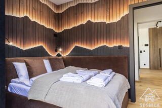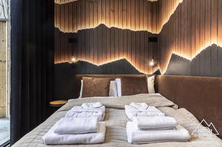 Apartment A46A is a stylish, expressive space designed for guests who appreciate modern design and mountain-inspired comfort. Darker accents, natural wood, and decorative lighting inspired by the mountain range create a unique atmosphere conducive to relaxation after an active day.