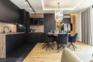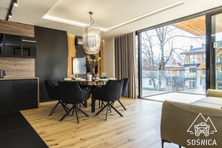The central part of the apartment is a spacious living room with a kitchenette and dining area. Large windows open up the interior to views of Giewont, a unique feature of everyday living. The kitchenette is fully equipped – instead of a microwave, guests have an oven, allowing for convenient meal preparation, even during longer stays.