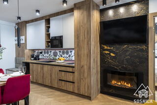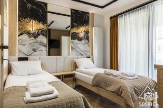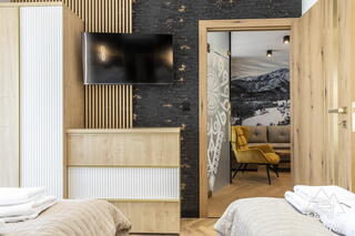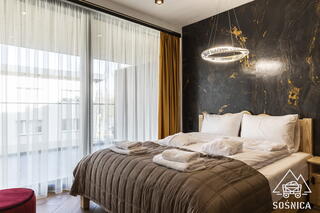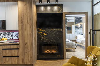 The focal point of the apartment is the stylish living room, with a striking decorative wall and electric fireplace, creating a cozy atmosphere regardless of the season. The glass-enclosed bedroom is a true centerpiece of the interior—subtle lighting, an elegant headboard, and golden marble-inspired decorations emphasize the luxurious character of the space. The second bedroom, equipped with two single beds, is perfect for families with children or two couples.