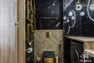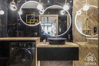 The bathroom impresses with its combination of noble materials: black marble, wood, and gold accents. A large illuminated mirror and designer fixtures give it a unique, boutique feel.