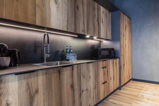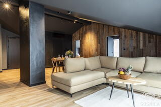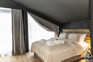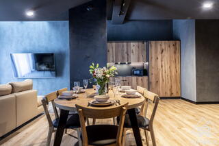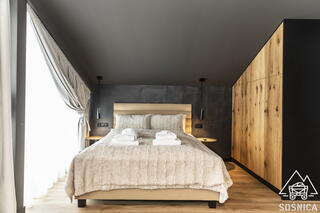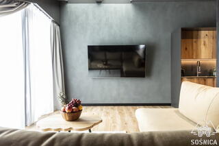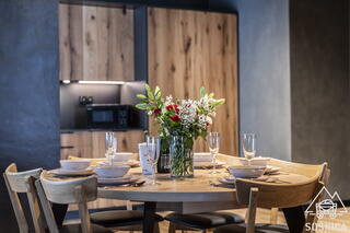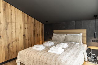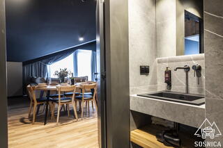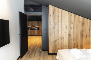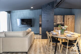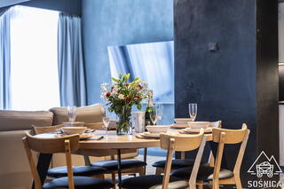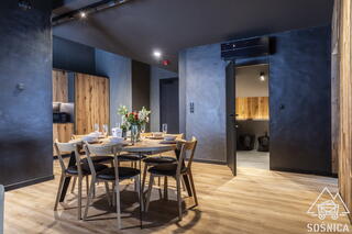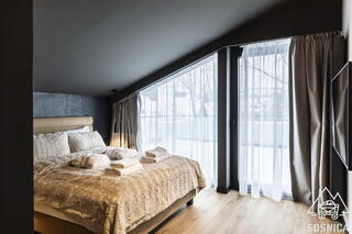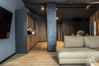 Penthouse B38 is an impressive space with a loft-like character, designed for guests who appreciate modern architecture, large-scale interiors, and a distinctive style. High, sloping ceilings, panoramic glazing, and a refined combination of wood, concrete, and dark accents create the atmosphere of an exclusive mountain retreat. The open-plan living area with a large sofa and dining area encourages socializing, while the comfortable bedrooms provide privacy and the highest level of relaxation.