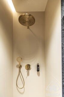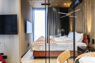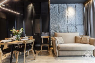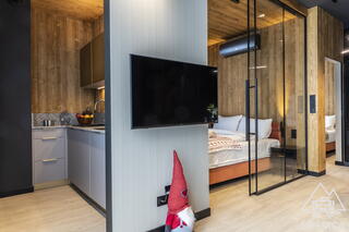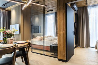 The living area includes an elegant living room with a comfortable sofa and a dining area. The kitchenette has been functionally designed, allowing for the convenience of preparing meals for both short and long stays. A modern bathroom, finished to a high standard, completes the overall experience, offering comfort and aesthetics comparable to those found in a hotel.