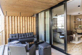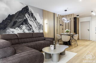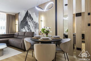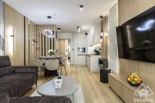 The centerpiece of the apartment is a spacious living room with a large, comfortable sofa and a lounge area with a TV. Subtle lighting, decorative wall panels, and modern design solutions give the interior an elegant, hotel-like character. The living area seamlessly connects with the kitchenette and dining area, creating a functional space for spending time together.