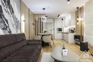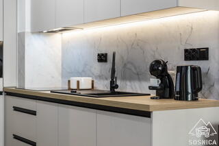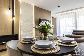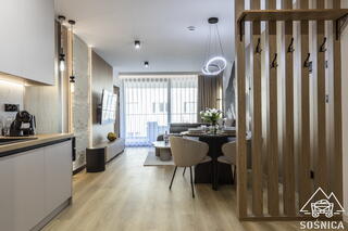 The kitchenette is designed in a modern style and equipped with high-quality appliances, allowing for comfortable meal preparation. The dining room, with comfortable chairs, is the perfect place for shared breakfasts and dinners.