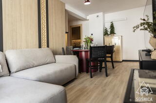 The apartment offers two separate bedrooms, providing comfort and privacy for both families and two couples. The spacious living area combines a comfortable living room with a dining area and a functional kitchenette, allowing for spending time together and preparing meals in a comfortable setting.