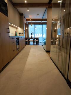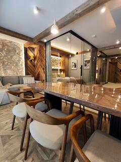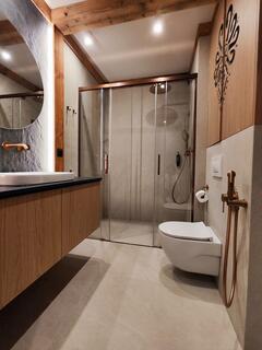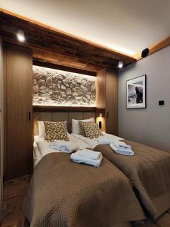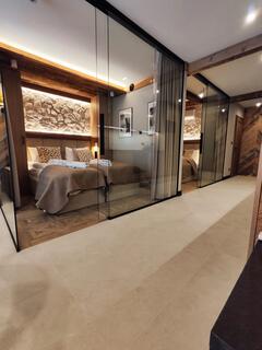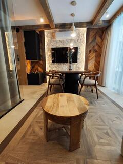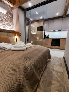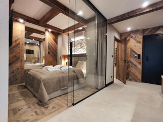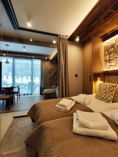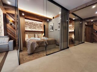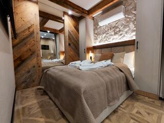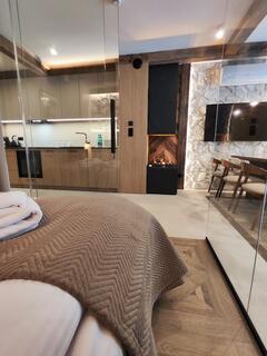 Apartment A21 is an elegant and spacious room decorated in a modern style with distinct mountain accents. Natural wood, stone finishes, and warm lighting create a unique atmosphere, while the fireplace in the living room further enhances the cozy character of the interior and encourages relaxation after a day spent in the mountains.