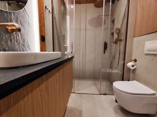The bathroom has been finished to a high standard—a modern shower stall, elegant fixtures, and a bidet faucet enhance the comfort of daily use.