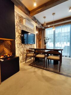 Apartment amenities: kitchenette, induction cooktop, oven, microwave, kettle, coffee maker, dishwasher, dishes and cutlery, TV, Wi-Fi, fireplace, shower, washing machine, bidet faucet, hair dryer, towels, iron, bathrobes (for adults), heating, air conditioning.