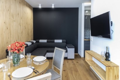 The apartment is decorated in modern style with wooden elements . The apartment has one bedroom, a living room with a sofa and a fully equipped kitchenette with a fridge, a dishwasher, a coffee machine. Flat-screen TV are offered. Apartament features free WiFi. In order to make your apartment shine, we follow a check list, which covers eighty items and we additionally verify the quality of this service.