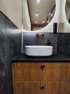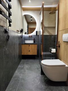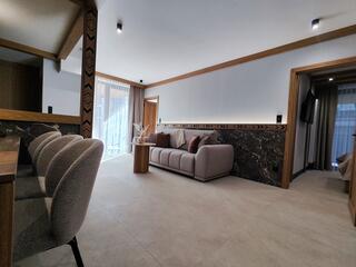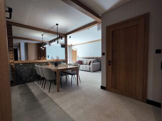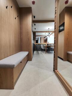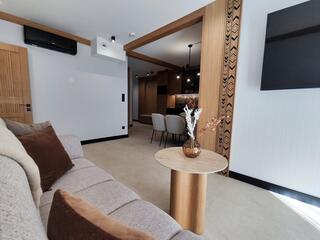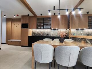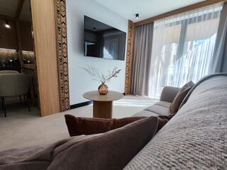 Apartment B18 is a comfortable and modern space designed with attention to detail, inspired by the Podhale style. The combination of natural wood, subdued colors, and decorative elements inspired by highland tradition creates an elegant yet cozy interior, perfect for relaxation.