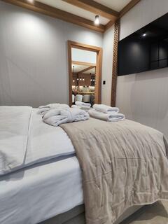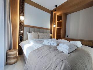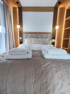 The apartment features a bedroom with a comfortable double bed, ensuring a peaceful and comfortable night's sleep. The living area is designed as an open space, combining the living room with the dining area and a functional kitchenette. This allows guests to comfortably spend time together, relax, or prepare meals in a pleasant atmosphere. Extensive glazing ensures ample interior lighting, and air conditioning guarantees comfort regardless of the season.