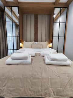 Apartment equipment: kitchenette, induction hob, microwave, kettle, coffee maker, dishwasher, dishes and cutlery, TV, Wi-Fi, air conditioning, shower, bidet tap, washing machine, hair dryer, towels, iron, bathrobes (for adults), heating.